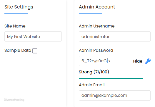 • Admin Username: Your new Concretecms username (for security reasons, do not use the administrator or the admin username).