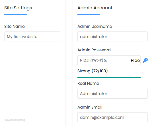 • Admin Username: Your new e107 username (for security reasons, do not use the administrator or the admin username).