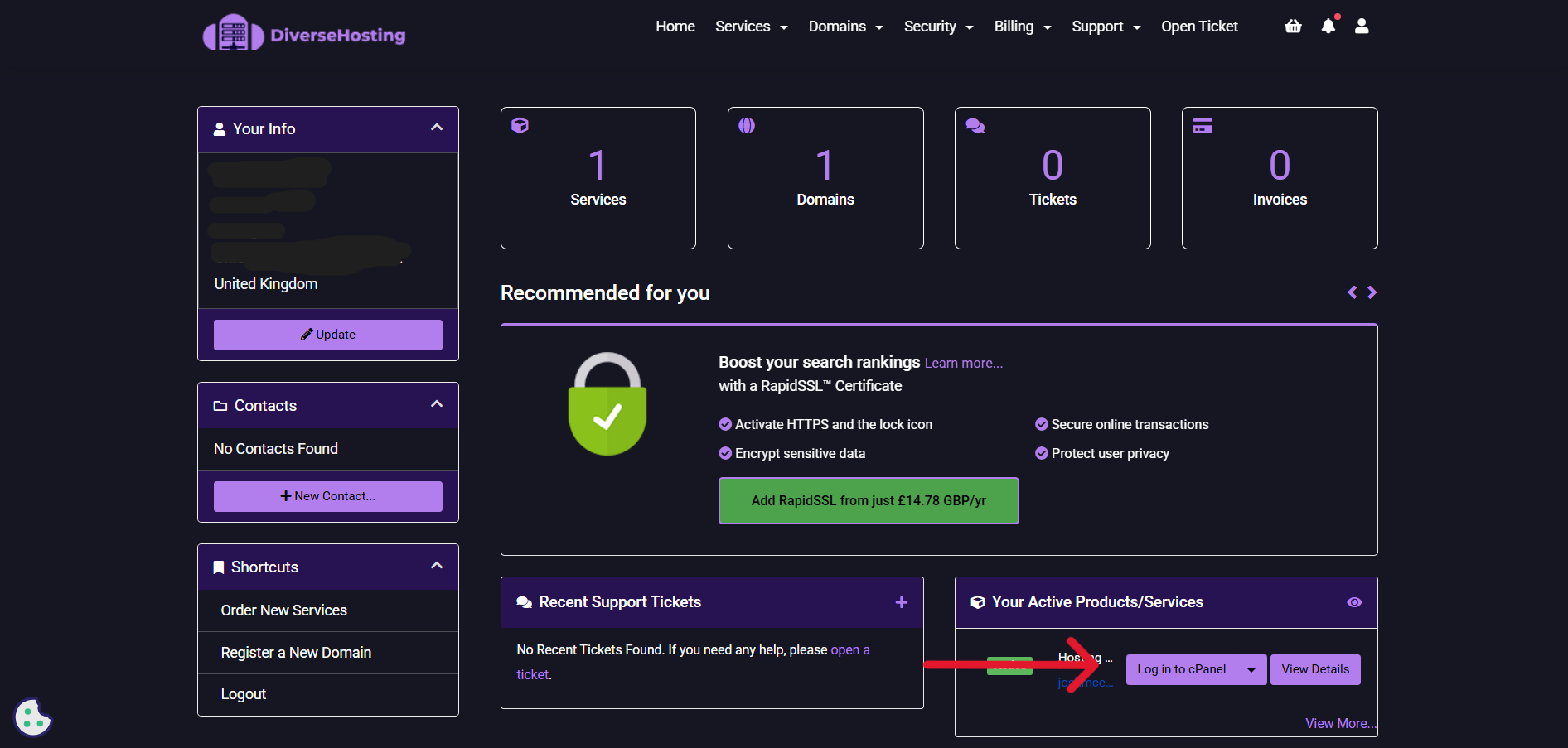 1. Sign in to your DiverseHosting Client Area
