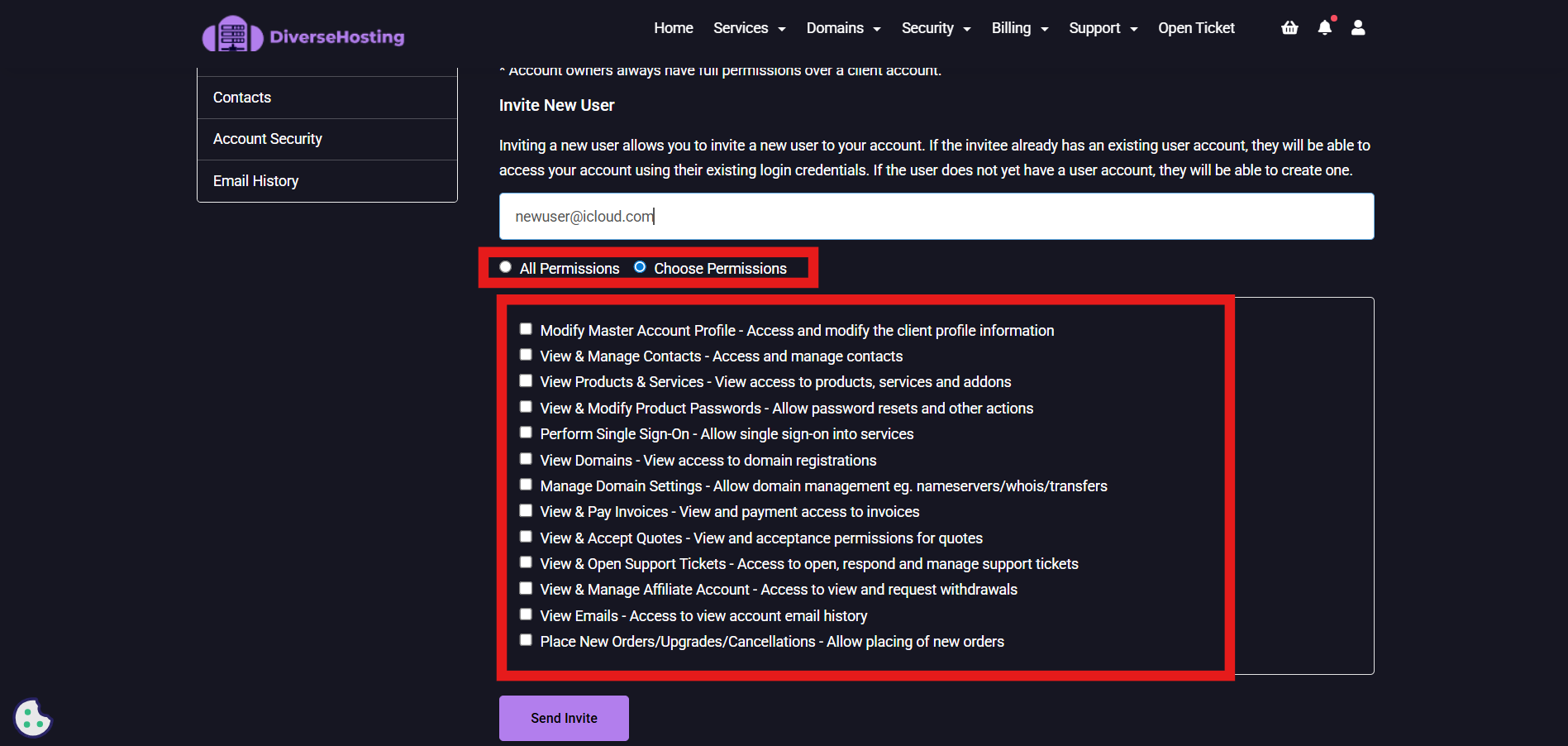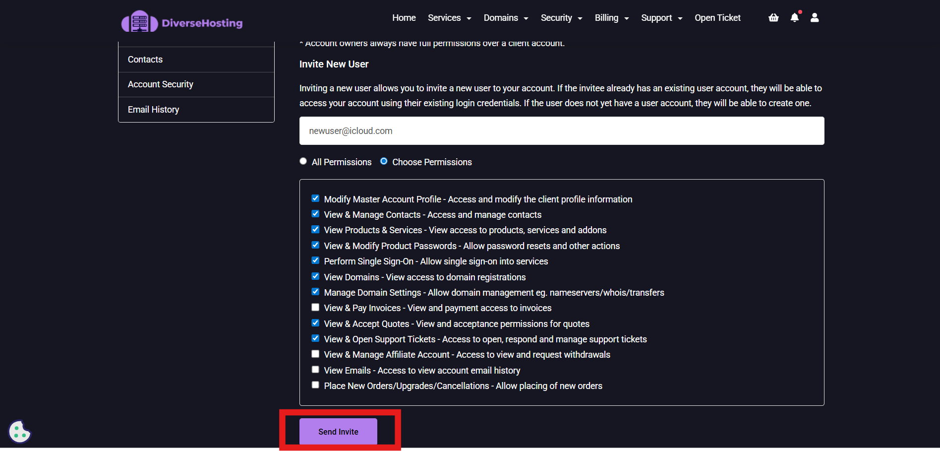 5. Once you have selected the correct permissions, click 'Send Invite'.